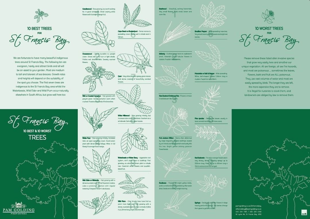 We are fortunate to have many beautiful indigenous trees in and around St Francis Bay. The 10 Best Trees are evergreen, hardy and attract birds and all will be an asset to your garden. Most are medium to tall and tolerant of sea breezes. Growth rate and height will depend on the suitability of the spot you choose.