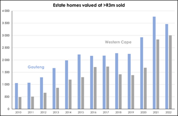 “While Gauteng is home to the largest number of homes in estates, the Western Cape has more high-value estate homes. In terms of actual sales, the shift in estate sales towards the Western Cape is the most noticeable in the R3 million+ price band. In 2010, Gauteng sold twice as many >R3 million estate homes than the Western Cape (1 060 vs 488) according to Lightstone. Sales in this price band increased steadily until 2015, when transactions concluded stabilised before rebounding once again in the wake of Covid. By 2022, Gauteng registered just 13.3% more >R3m estate homes than the Western Cape – highlighting the far stronger growth in the top end of the estate market in the Western Cape,” says Dr Golding.