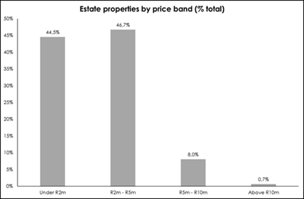 “Furthermore, Lightstone data reveals that at the end of 2022, nearly 190 000 estate properties were valued at less than R2 million, while 196 000 were valued at between R2 million and R5 million (chart below). Almost 35 000 were valued at more than R5 million.