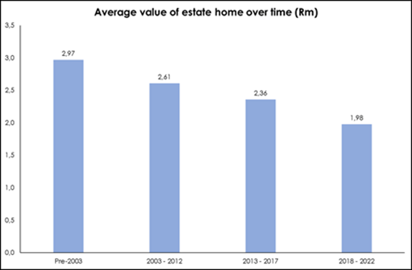“To illustrate how the estate sector has become more diverse and affordable to a broader range of homebuyers, the graph below from Lightstone shows how the average estate property value has declined from nearly R3 million prior to 2003 to just under R2 million between 2018 and 2022.”