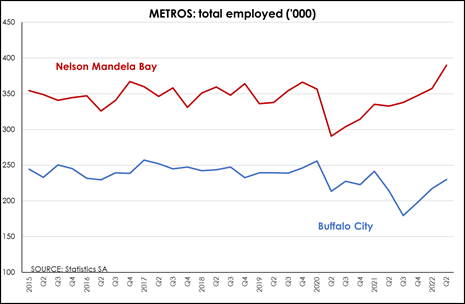 While Buffalo City (which incorporates East London) has experienced a partial recovery in employment, particularly in recent months, employment in NMB rose to 390 000 in Q2 2022 – comfortably above its pre-Covid level of 356 000 in Q1 2020.