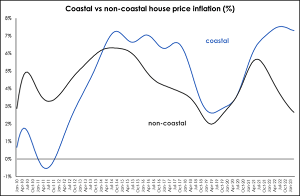 Notably, in the lower price band below R1 million, house price growth continued to gather meaningful momentum at +7.6% above year-earlier in June. Another standout statistic is the steady widening of the coastal price premium (within 5km of coastline) to +4.6% in Q1 2023. This is due to the fact that although the revised coastal house price inflation rate has clearly peaked, non-coastal HPI is losing momentum.
