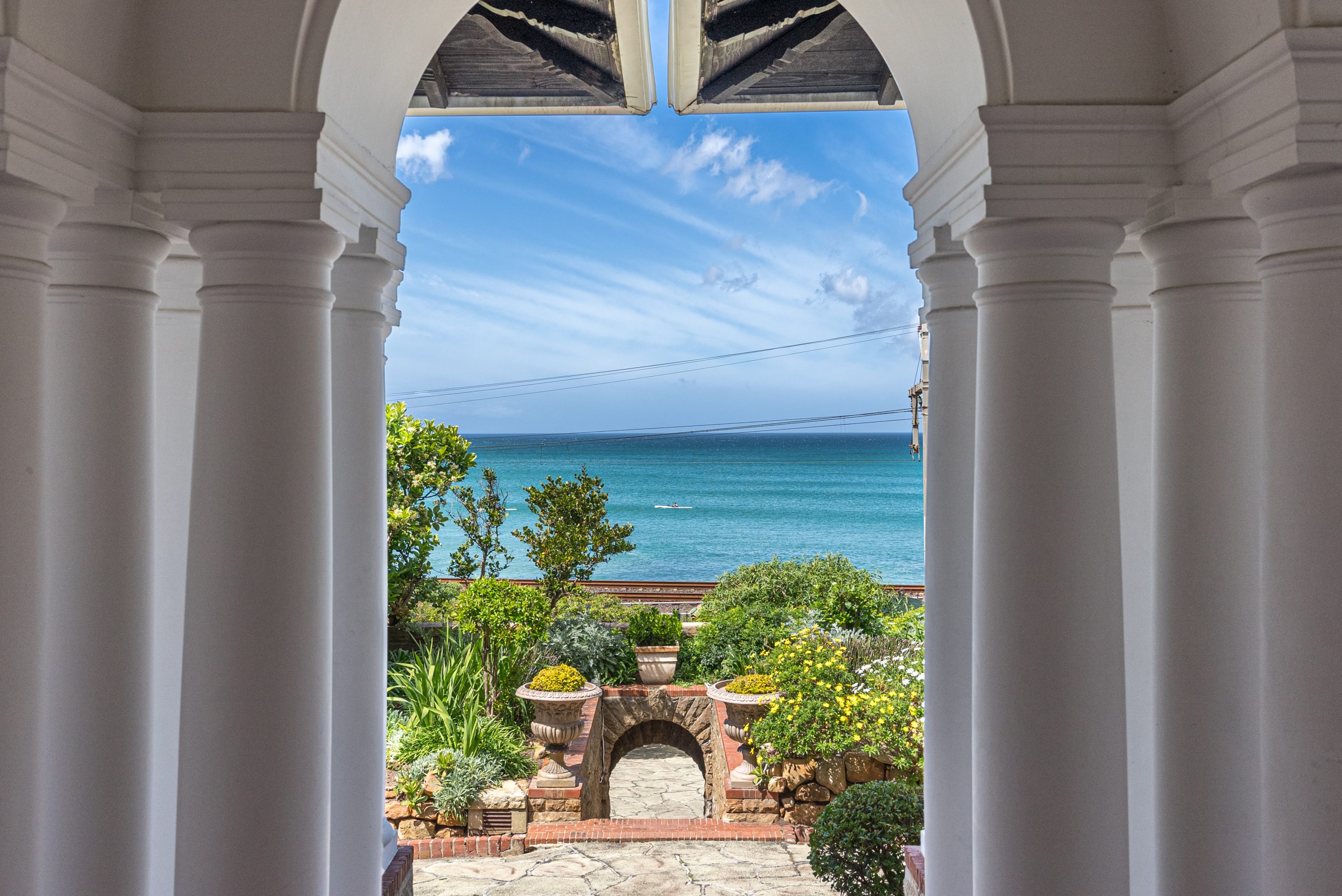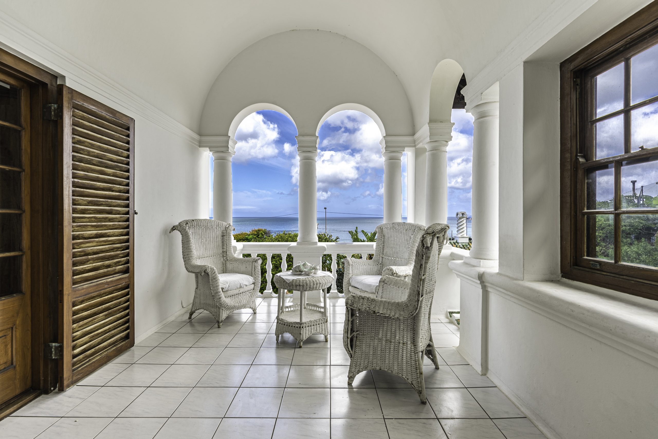 A classic wide staircase leads from the hallway to the upper floor which comprises a spacious landing opening to a pillared verandah and four very generous bedrooms en suite. Two sea-facing suites open onto private balconies which face the sea and two look out over the gardens and mountain behind.