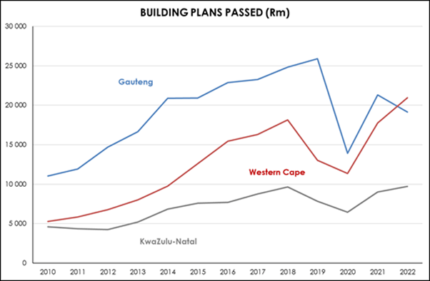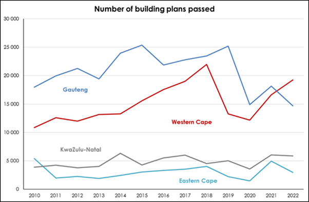 Gauteng, which accounts for the second-largest number of residential building plans passed, was experiencing strong growth untilCovid, but has since failed to recover from the impact of the pandemic and passed fewer residential building plans in 2022 than in 2010.