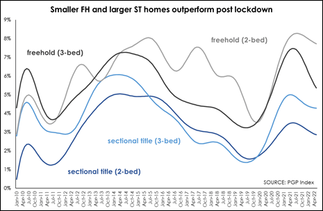 “Similarly, for those who could not afford freehold homes or who preferred the lockup and go lifestyle offered by a sectional title home, the desire for more space – particularly for those working from home – was reflected in stronger price growth in larger (three-bedroom) sectional title property prices.”