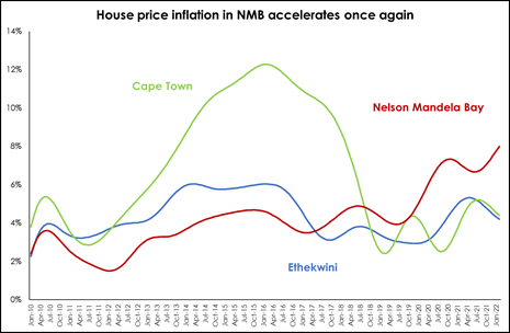 And while house price inflation in the major metro housing markets is slowing in tandem, Nelson Mandela Bay is experiencing accelerating growth in prices, outperforming relative to other coastal metro housing markets.