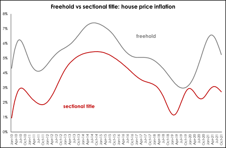 When looking at freehold and sectional title homes by size, all categories are now showing a slowdown in house price inflation. However, during the course of last year and during the year to date (data available until October 2021), smaller freehold homes have experienced the strongest growth in prices, followed by three-bedroom freehold. In contrast, larger (three-bedroom) sectional title homes have registered stronger price growth than smaller sectional title homes.