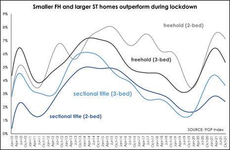 This desire to relocate was partly in response to lockdown, which made a larger house a necessity due to work-from-home (WFH) and home schooling, and outdoor space in particular more appealing. The ability to WFH made it feasible to consider suburbs and towns that had previously been too far from schools and the workplace, but which typically allowed homeowners to buy larger, more affordable freehold homes, which in turn saw a temporary pause in the long-term structural shift in the national housing market towards sectional title homes.