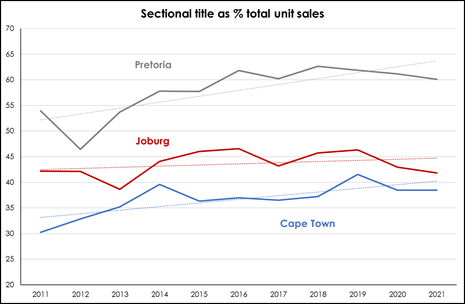 In 2011, just 30.3% of all homes sold in Cape Town were sectional title. By 2021, this had risen to 38.5%. In Johannesburg, the shift was from 42.2% in 2011 to 41.8% in 2021, reflecting essentially no change, although the underlying trend line shows a slow steady rise. In 2011, more than half of all home sold in Pretoria were sectional title – a percentage that has risen from 53.9% in 2011 to 60.1% thus far this year.