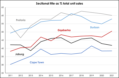 Notably, 2021 is the first year in which sectional title sales have accounted for more than half of total sales in Gqeberha. In Durban, the last time sectional title sales were less than 50% of all sales in a single year was 2011.