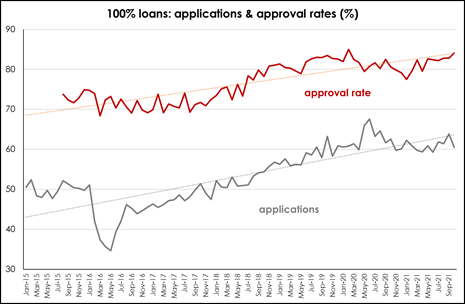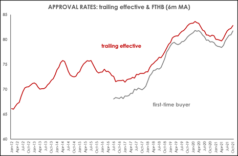 Approval rates declined during the initial stages of the pandemic, reaching a lower turning point in April 2021, but have since started rising once more. At 82.8% in Oct’21 (81.7% for first time buyers) approval rates are rapidly approaching pre-Covid highs.