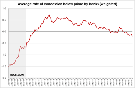 The average concession relative to prime has now been in negative territory for a full year and, after declining to -0.2% in October 2021, is currently at a level last seen more than a decade ago. A gradual rising trend (from -0.16% in June to -0.12% in September) did seem to suggest that lending conditions were tightening as banks grew more cautious – but this was reversed in October with a move back to -0.2%. According to ooba, home buying and mortgage lending have thus far remained relatively immune to the pandemic and in fact have been boosted by the pandemic as a result of changed lifestyles and banking trends.