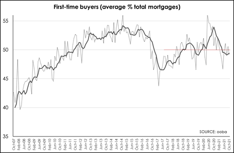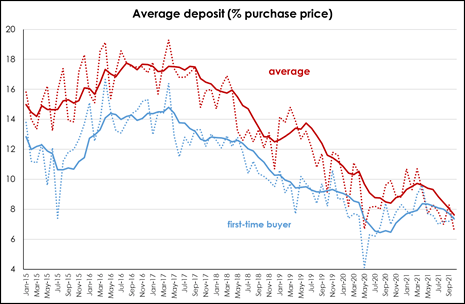 Deposits as a percentage of purchase price reached a low in late-2020, rose again for several months before declining once again since the start of Q2 2021. While the average deposit (as a percentage of purchase price) fell to an all-time low of 6.6% in October 2021, for FTHB (7.5%) it remains above the levels reach in mid-2020 when the initial surge of buying by first-time buyers emerged (4.1% in May 2020).