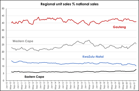 The above four provinces account for a growing percentage of total SA unit sales – rising from 81.9% in 2010 to 84.8% in 2021 YTD. This reflects the rapid urbanisation in South Africa, which is seeing young people relocate to the economic hubs of the country which are located in these provinces.