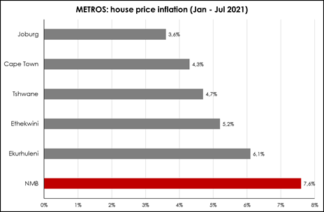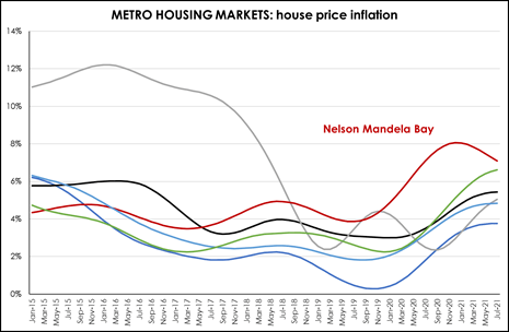 The top performing metro market is Nelson Mandela Bay (NMB), where house price inflation has been outperforming all metro markets except Cape Town since mid-2019 – perhaps due to ongoing semigration to the coast – and subsequently outperformed relative to Cape Town since January 2020.