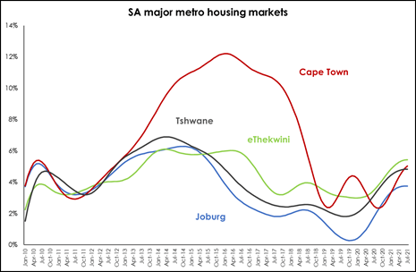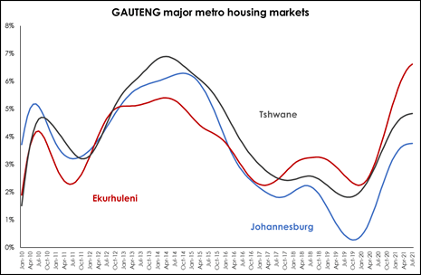 Within Gauteng, Ekuruhleni is showing the strongest performance, with price inflation accelerating to 6.6% in July, while price growth in both Johannesburg and Tshwane appears to be peaking. Price growth in Ekuruhleni has been faster than in the other two sub-regions since mid-2020, perhaps benefitting from an influx of new buyers because the metro housing market offers more affordable homes and/or more space amidst a desire for freehold homes or larger apartments for work from home.