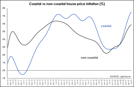 Coastal: Since early 2015, homes within 5km of the coastline have enjoyed stronger price growth than non-coastal homes (further than 5km from the coastline), except for a brief period between September 2019 and July 2020. Since then, the so-called coastal premium has widened steadily and currently stands at +1.6% In July 2021 (latest available data).