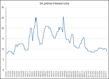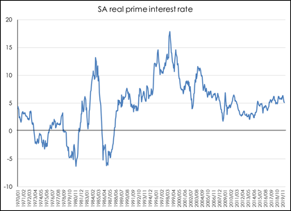 Notably, there have only been two previous occasions since 1970 when the prime interest rate has been cut this low (see chart below). Prime was at 8.5% between July 2012 and December 2013 and was below current levels in the early 1970s. However, real prime interest rates reveal that there is still room for further reductions (see second chart).