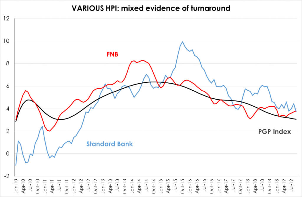 While the Standard Bank and PGP House Price Indexes continue to slow, the FNB index has rebounded somewhat in recent months. During the year to date (September), the PGP Index has averaged 3.21%, FNB = 3.54% and Standard Bank = 4.12%.