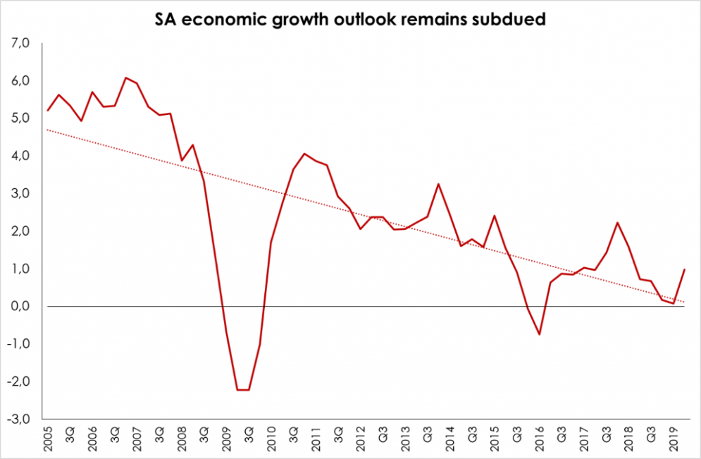 SARB GDP growth forecast 2019 = 0.6%, 2020 = 1.5% and 2021 = 1.8%