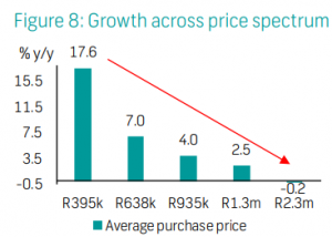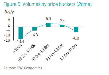 According to FNB, despite the slowdown in sales volumes, the middle income categories continue to see growth in unit sales from year-earlier levels while the lower and the upper ends continue to contract. The decline in lower end sales can be attributed to a deterioration in affordability high levels of unemployment, while the upper end is presumably impacted by a loss of confidence and the fact that many sellers can afford to sit out the market down-cycle.