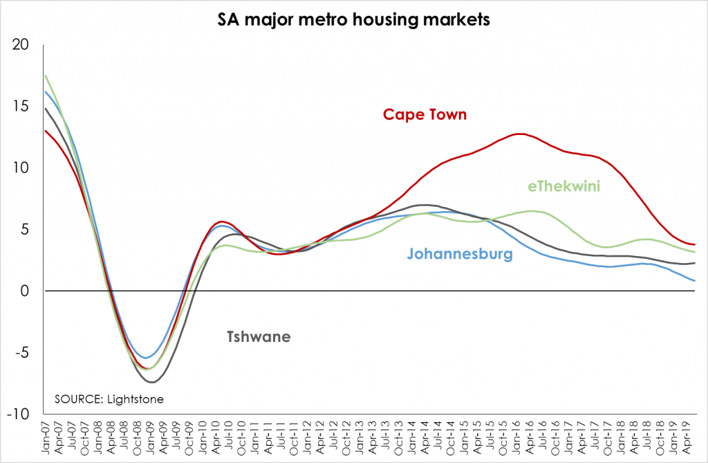 The rebound evident at a regional level (data to September 2019) is not yet visible at the metro level (June 2019 latest data). Nevertheless, house prices in both Cape Town and Tshwane metro markets are showing tentative signs of stabilising (see below).