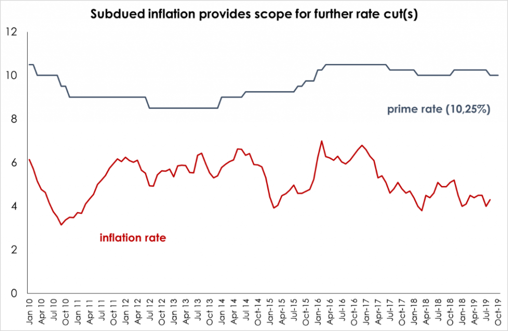 However, there is one upside to this sustained period of weak growth. Price pressures from higher global oil prices and/or Rand weakness are having limited impact on the inflation rate, which is stabilising around the mid-point of the inflation target range (3-6%). This means that there is little pressure on the Reserve Bank to raise interest rates. There is even a small chance of a further 0.25 bps rate cut in November this year or in early 2020, but other than that, interest rates are expected to remain steady for an extended period of time.