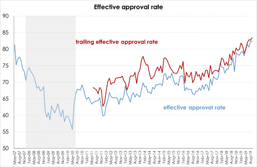 The effective bond approval rate continues to rise – reaching levels last seen just before the 2008/09 recession, rising to 83.4% in September and averaging 81.4% so far this year – up from 77.4% during 2018 overall.