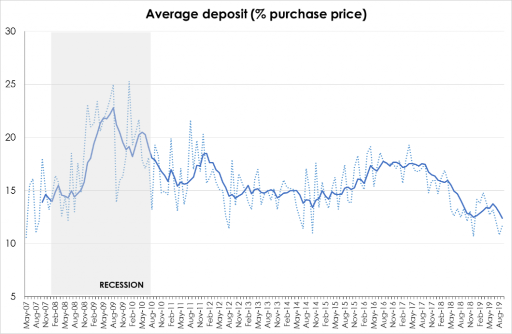 The average deposit is also declining, again reaching levels last seen just prior to the 2008/09 recession. In August the ratio of loans to value had declined to 10.8% before rebounding to 11.7% in September. For the year to date, the average deposit to loan was just 13.02% while for first-time buyers, the average deposit paid during the year to date is 9.38%.