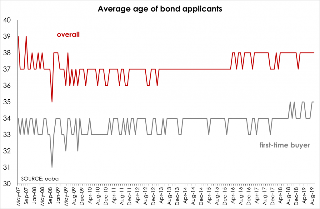 According to ooba, the average age of bond applicants overall has remained steady at 38 years for some time now, after rising from 37 to 38 in late 2016, while the average age of first-time buyers has risen in the past year from 33 to 34 years.