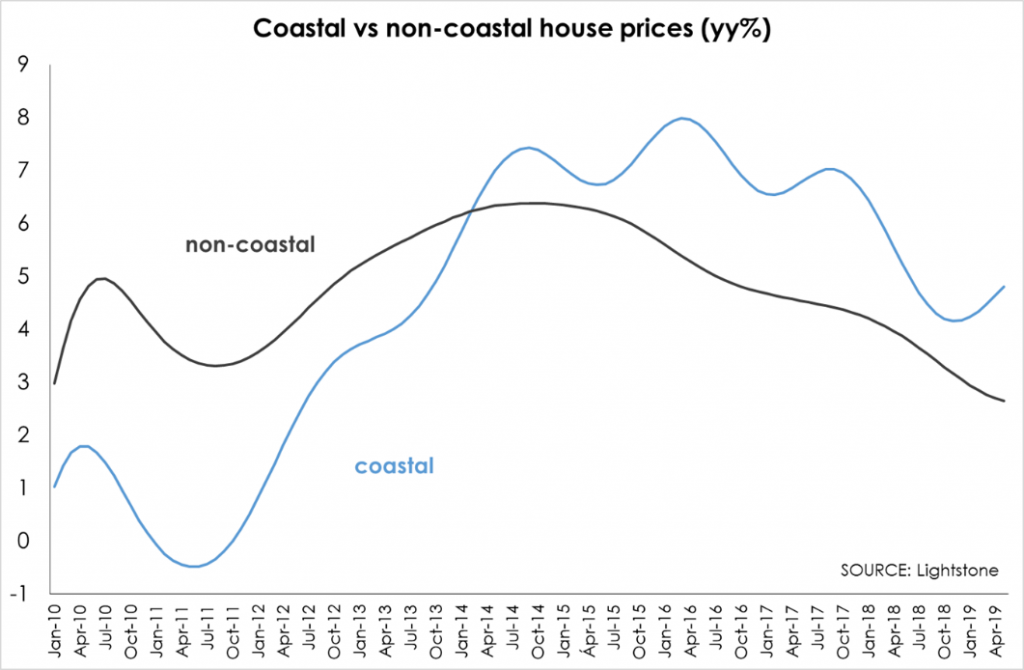 Coastal properties (homes located within 500 metres of the coastline) continue to enjoy a price premium which has risen from a low of 0.9% in Sep/Oct 2018 to a level of 2.13% in June 2019 (latest available data).