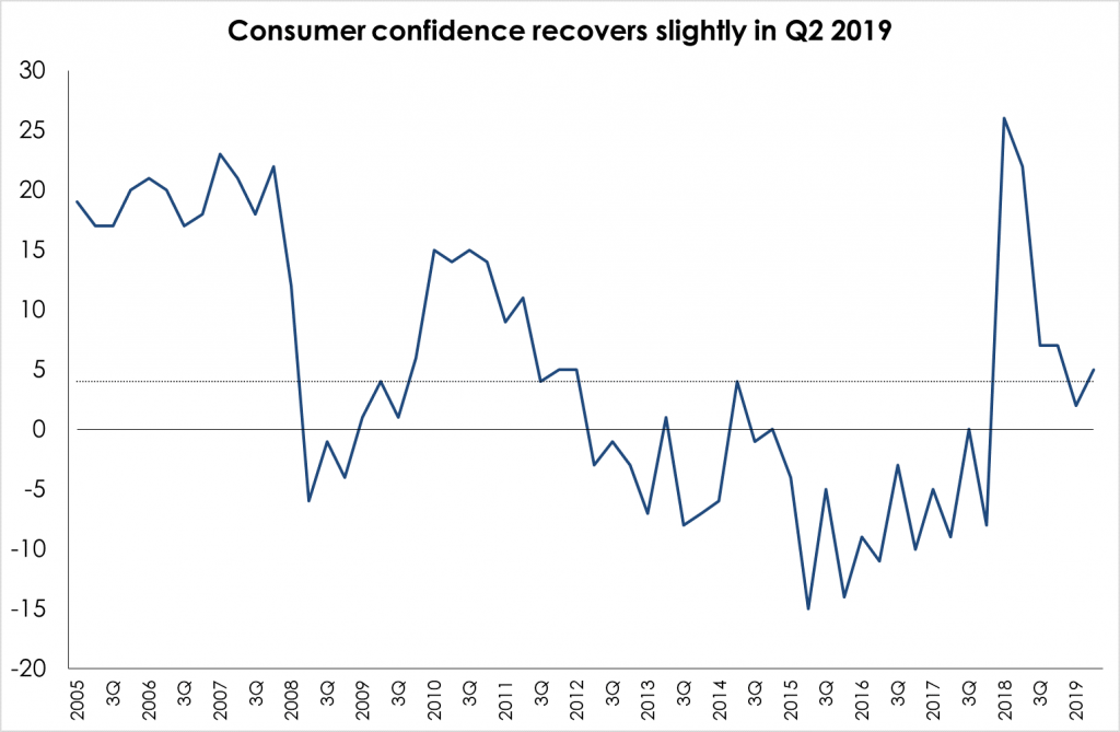 Overall, 2019 is proving to be another year of tepid economic growth (see chart below), resulting in yet another year in which government revenues have disappointed – placing additional pressure on the country’s financial situation and in turn, on consumers.