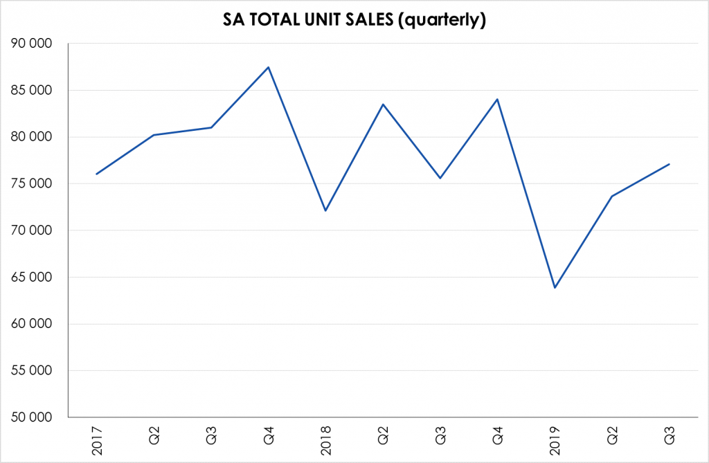 According to Lightstone, although total unit sales slumped in the first quarter 2019 (quite possibly due to load shedding and pre-election jitters) they have since rebounded strongly. Further good news is that conditions in the national property market are, nonetheless, beginning to stabilise. From a low in Q1 2019, unit sales have since risen steadily from 63 887 in Q1 to 73 656 in Q2 to 77 086 in Q3. And unit sales during the first half of 2019 remain just over 11% below year-earlier levels, Q3 2019 sales are 2% above year earlier levels (i.e. above Q3 2018).