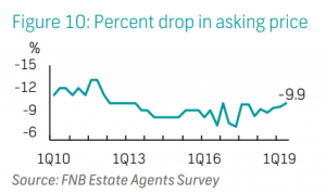 The fact that the market remains slightly oversupplied (imbalanced) is highlighted by the increase in the percentage of sellers who have to drop their asking price. According to FNB, this rose to 98% in Q2 2019 – the highest percentage of sellers since 2007. Furthermore, the average price drop rose to 9.9% in Q2 – slightly above the historical average of 9% since 2010 (see chart below). This underlines the critical importance of accurate, market-related pricing when a property is first brought to market. Buyers are well-informed and many under financial pressure, so a serious seller is advised to price right.