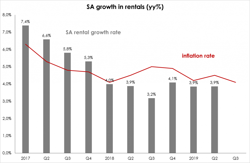 Growth in national rentals has been slowing steadily since early-2017 – declining from 7.4% from year earlier levels in Q1 2017 to a low of 3.2% in Q3 2018. Growth in rentals has fallen below the prevailing inflation rate since Q1 2018 but has at least stabilised at 3.9% during the first half of 2019 even as the inflation rate continued to surprise on the downside. Real (inflation adjusted) rental growth declined by an average 0.5% during the first half of the year, according to PayProp.
