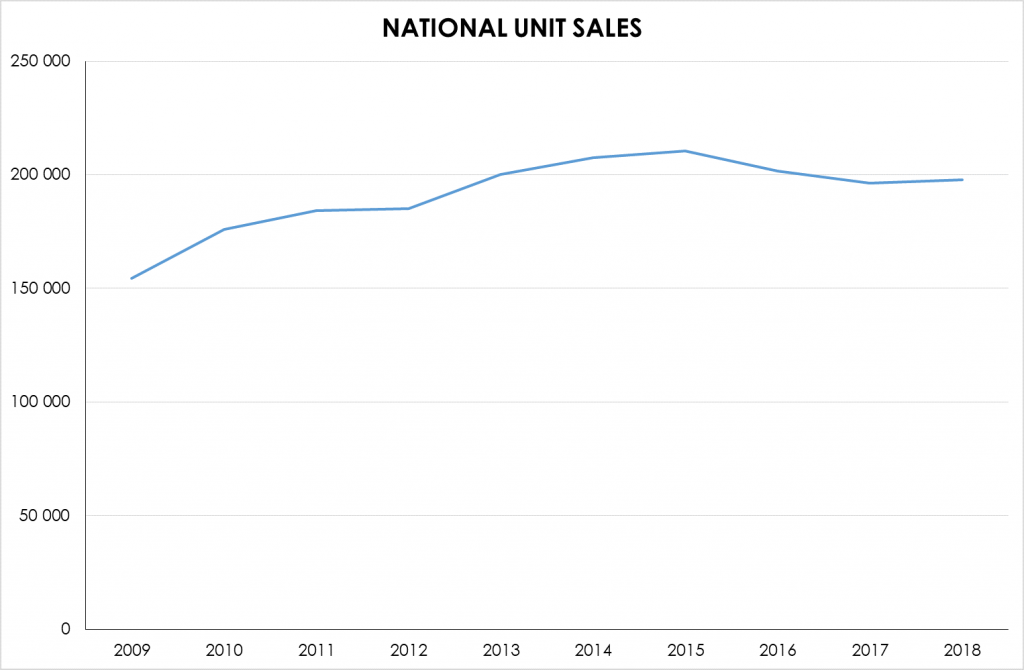However, this is seen against a backdrop which reveals that total housing activity slowed from a peak of 210 465 units sold in 2015 to 196 375 units in 2017 before rebounding modestly in 2018. Sales last year totalled 197 634 units – nearly 13 000 units or 6.1% below the 2015 peak.