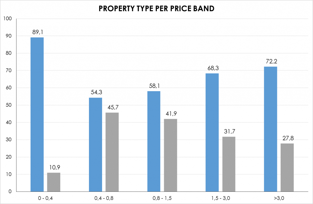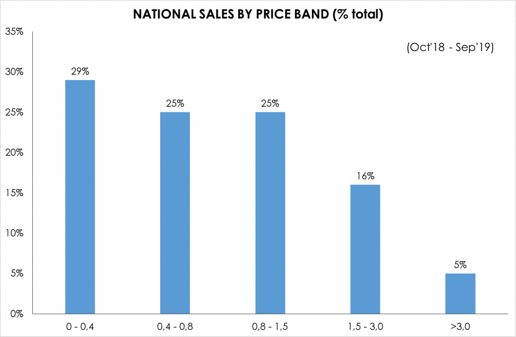 During the past 12 months (Oct’18-Sep’19), freehold sales have dominated in all price bands – particularly in the <R400 000 category (largely affordable housing) and in the upper price bands (notably >R3m). Sectional title properties account for almost half all sales in the R0.4 – R0.8m and just over 40% in the R0.8 – R1.5m price band.