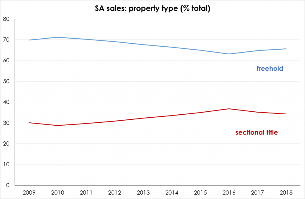 Of interest is the shift from freehold to sectional title which is evident in the national sales, with freehold properties accounting for 71.2% of all sales in 2010 – declining to 63.1% in 2016 before rising to 65.7% in 2018. (As affordable housing is typically freehold, the shift to sectional title homes is likely to be more evident if one were to exclude affordable housing).