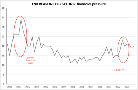 “While the pandemic prompted a sharp rise in the percentage of homeowners selling because of financial pressure, this has eased off from a peak of 23% in Q3 2020 to 20% in Q4 2021, according to the FNB Estate Agent Survey. The impact on the housing market was also significantly lower than during the global financial crisis when sales due to financial pressure peaked at 34% in Q2 2009.”