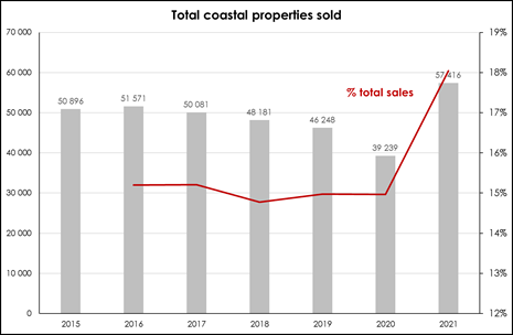“Initially the rebound in the property market was driven by first-time home buyers, who took advantage of the 50-year low interest rates to opt to purchase rather than rent. As this initial wave of activity faded, a second wave emerged driven by older, more affluent repeat buyers who responded to the opportunity to work from home by purchasing larger homes and/or by relocating to towns previously considered to be predominantly holiday or retirement destinations, which offered both more affordable homes and a more relaxed lifestyle. The shift in home buyers to coastal towns and villages is evident in the marked increase in the sales of coastal properties in 2021, with the percentage rising from 15% of all sales in 2020 to 18% in 2021. (Coastal: within 5km of coastline).