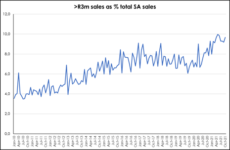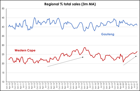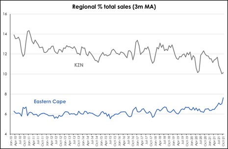 “The Eastern Cape also appears to have benefitted post-pandemic, with sales growing from around 6% of national sales to 7.6% in late-2020, while KwaZulu-Natal saw a reduction in sales from a peak of over 14% in early 2011 to 10.1% in late 2021.”