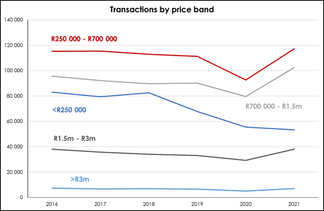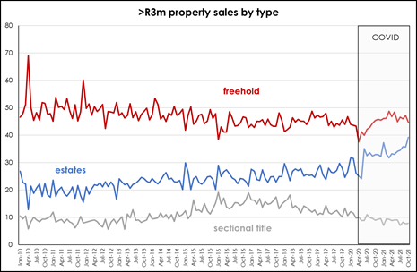 “In the >R3 million price band, freehold homes remain the largest type of home sold, with the declining gradual trend reversing in the wake of Covid. Estate sales have been rising steadily for some time but accelerated once the pandemic struck. These trends are most likely due to the desire for increased living and open space, as well as limited access to external factors.