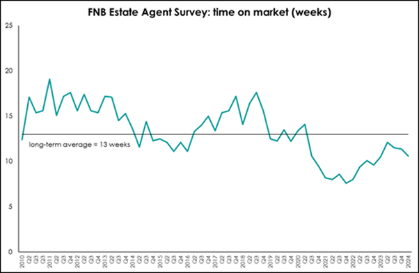 “According to FNB’s estate agency survey, increased housing market activity saw time on the market improve from 11 weeks and four days in Q4 2023 to 10 weeks and six days in Q1 2024, led by the Western Cape, where time on the market fell to seven weeks and one day, while Gauteng also registered an improvement.