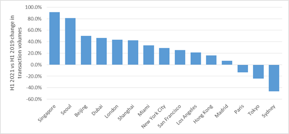 Property markets in Chinese cities remain relatively unaffected due to the avoidance of severe lockdowns. For the city-state of Singapore, there was a Covid-related dip in transaction volumes from March to May 2020, but transactions have roared back to above pre-pandemic levels with volumes in the first half of 2021 nearly double the volumes seen in the first half of 2019. Conversely, transactions in Tokyo remained robust in 2020, but rising case rates in 2021 have pushed transactions down – 24% lower than the same period in 2019.