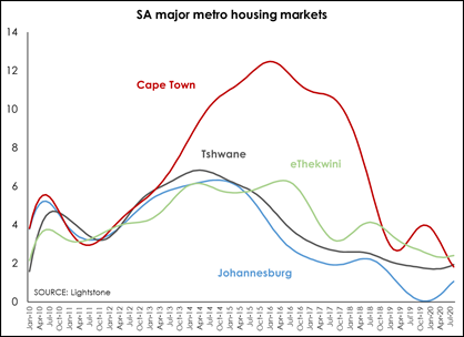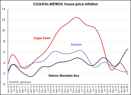 Cape Town’s period of outperformance relative to the other major metro housing markets has also come to an end, with house price inflation slowing rapidly during the course of 2020. The one metro which has outperformed Cape Town since October 2018 is Nelson Mandela Bay, which is reflective of the strong growth in the regional market. This may well be attributable to the semigration of South Africans to coastal towns, with the Eastern Cape (as well as KwaZulu-Natal) benefiting due to affordability and its lifestyle offering.
