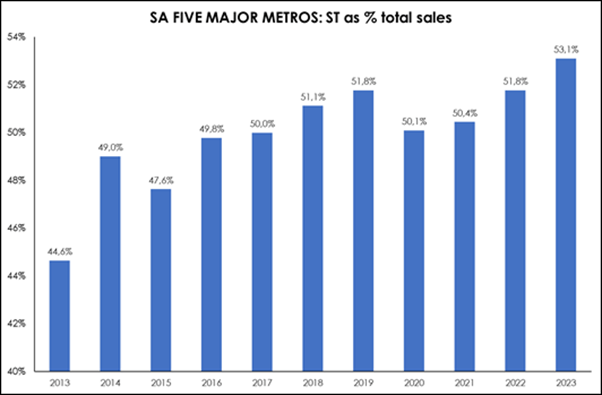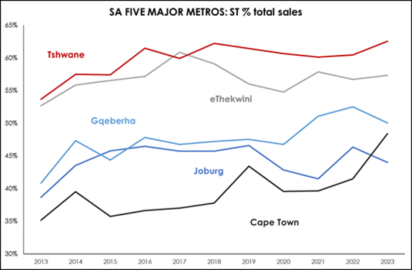 Dr Golding says illustrating the demand for sectional title is the fact that in 2013 just 44.6% of all residential property sales across the five major metro housing markets were sectional title homes. By 2023, a decade later, the market share of sectional title property sales had risen to 53.1% – more than half of all homes sold.
