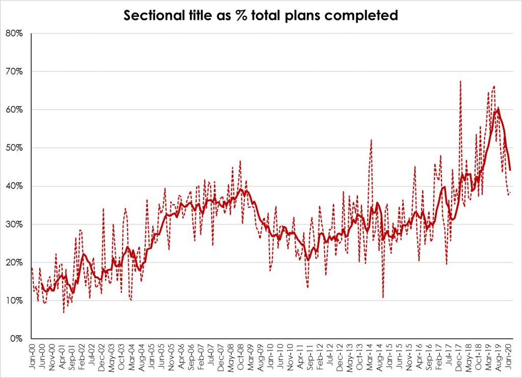 Says Dr Golding: “In 2000, 13.5% of all plans completed were for sectional title homes (the total includes homes under 80sqm, namely affordable homes). By 2019 this had risen to 54.9% (although this dropped to 46.1% in the first two months of 2020 – the latest data available). During the third quarter of 2019, sectional title as a percentage of total plans completed peaked at 59.7%.