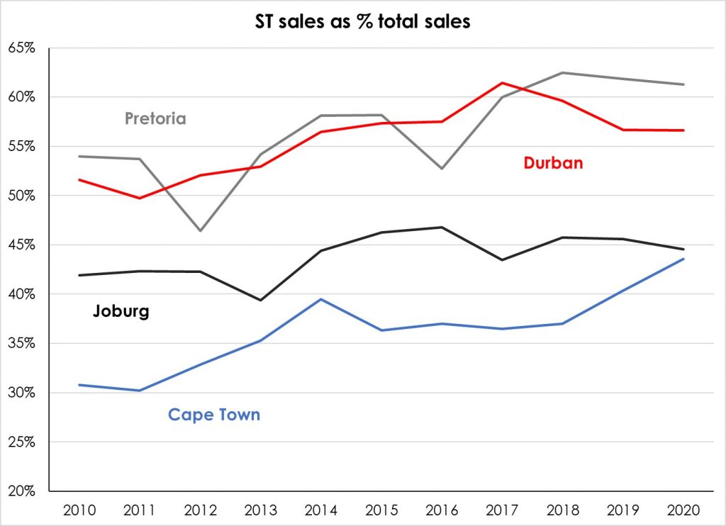 “Cape Town has also registered the strongest growth in market share for sectional title sales over the past decade, from 30.8% of all sales in 2010 to 43.6% in 2020, reflecting an increase of 12.8%.
