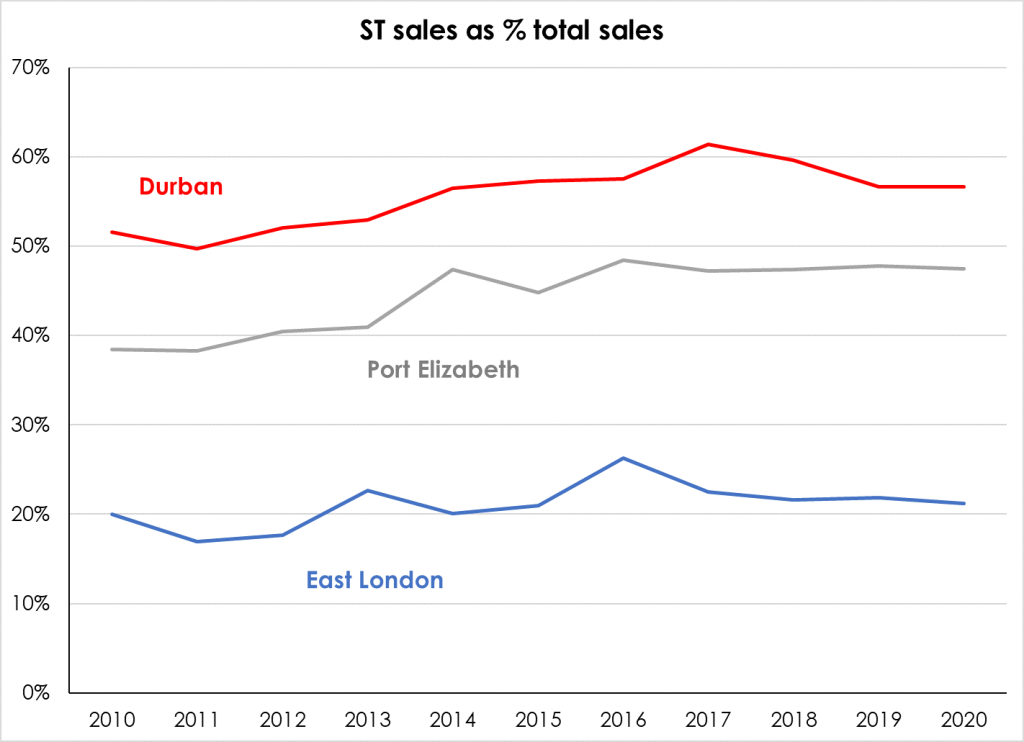 “Port Elizabeth has also seen a growing percentage of sectional title sales – 38.4% in 2010 rising to 47.5% in 2020, which is an increase of 9.1%. However, in East London, sectional title sales remain largely unchanged at just over 21% of total unit sales.”