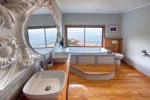 The clever use of reclaimed materials means that the home exudes a sense of understated luxury. A customized kitchen, with ample space for entertaining, has top-end finishes. Three of the four upstairs bedrooms boast panoramic sea and mountain views. Repurposed figureheads, taken from a film set, add a touch of dramatic glamour as the frames for bathroom mirrors.